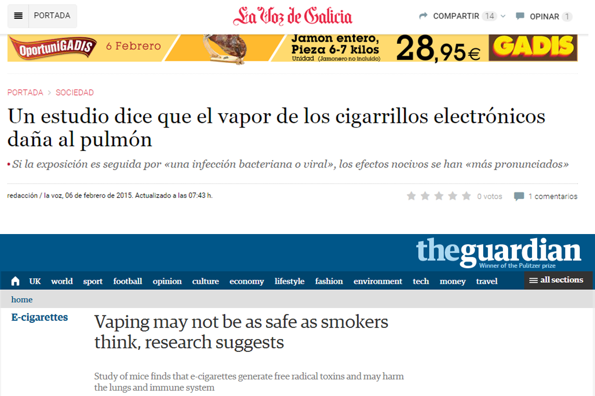 Aunque la ciencia ha establecido sobradamente que los cigarrillos electrónicos son órdenes de magnitud menos dañinos que los cigarrillos de tabaco, estos dispositivos han sido sometidos en muchos países a una potente campaña de desprestigio. Uno de los muchos ejemplos recientes es la avalancha de noticias sensacionalistas sobre el estudio publicado en New England Journal of Medicine sobre los altos niveles de formaldehído, cuando los cigarrillos electrónicos son sometidos a sobrecalentamiento.