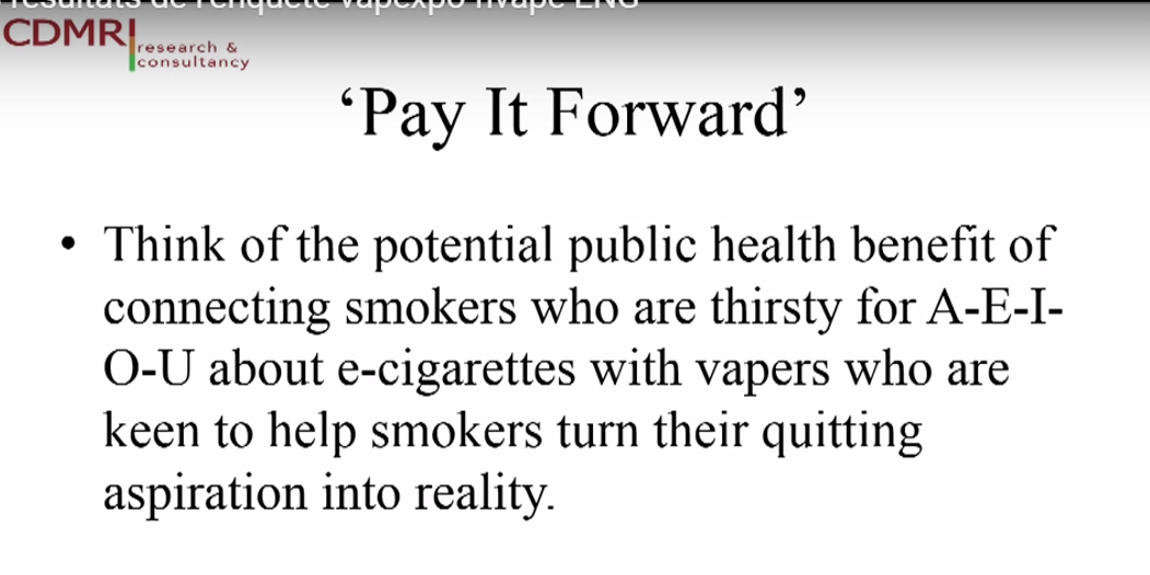 Por otro lado, están los vapers que han dejado de fumar gracias al eCig y son apasionados contando a la gente cómo lo consiguieron, especialmente a personas que también quieren conseguirlo. Estos vapers han amasado una ingente cantidad de información y experiencia personal sobre el eCig para ser impartida a todo aquel dispuesto a escucharles, tanto a académicos como yo y, lo más importante, a aquellos fumadores que quieren dejarlo.